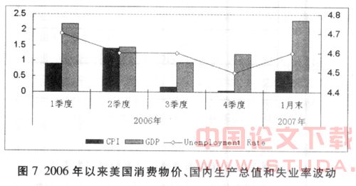 与利率因素的负面影响相对应,美国经济形势总体上也呈现非明朗化特点。和20世纪90年代美国“新经济”时期的增长不同,美国经济从2001年来的繁荣在很大程度上归因于外资流入,美国政府强硬、激进的对外政策导致战争持续,变相带动了相关重工业行业的景气。在外生因素带动下,外资不断流入美国股市和房地产市场,财富效应又刺激美国居民举债投资和消费,即使经常账户逆差扩大,又会被新流入的外资融通,如此形成了一个纯粹外生性的景气循环。但2006年开始,欧洲、亚洲和新兴市场等非美元主要币种反复升值,美元不断大幅贬值,美元资产缩水,这使投资人信心大受影响。