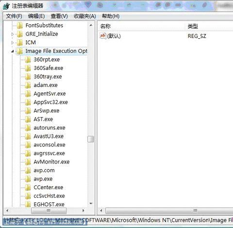 HKEY_LOCAL_MACHINE\SOFTWARE\Microsoft\Windows NT\CurrentVersion\Image File Execution Options这个位置。你会发现里面几乎包含了所有你知道的杀毒软件的进程名,病毒就是通过识别这些进程名来进行劫持的。所以有的时候你可以通过修改程序的名称。比如把360safe.com改为xxx.exx就可以运行了。当然不是绝对。例如对AV终结者就是无效的,因为他识别的是窗体标题。所以你可以发现的杀毒软件他们推出的专杀工具一般都是.com的扩展名,而且运行时候是没有标题的。这个就是为了防止被感染或者被强制关闭。