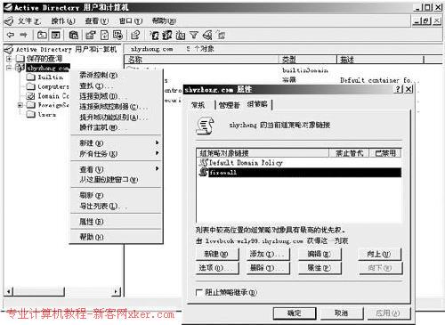 接着,再来看看DC是否响应了组策略。在DC服务器的“运行”栏中输入“dsa.msc”命令并回车,弹出“Active Directory”窗口后,请进入“shyzhong.com”(请根据实际情况选择)的属性窗口。在“组策略”选项卡部分可以看到保存的 firewall已经自动出现在列表中了。如果没有出现可以手工添加(图2)。