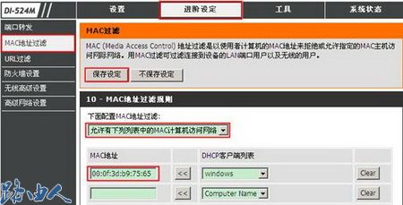在友讯无线路由器上选择允许下列列表中计算机访问网络,从DHCP客户端选择自己的计算机名称,点击﹤﹤,此计算机MAC地址就自动添加到列表里了,而其他计算机就会被阻止接入到友讯无线路由器。