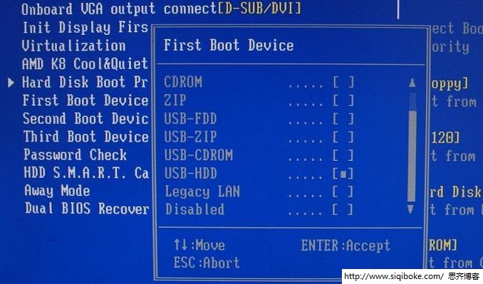 B、设置计算机从USB启动方法:可以选择USB-HDD或USB-ZIP(根据USB启动盘类型确定),首先选择First Boot Device,然后会弹出一个设备选择框,里面有几个选项(如下图),一般选择USB-HDD即可(视乎USB启动盘的类型)。