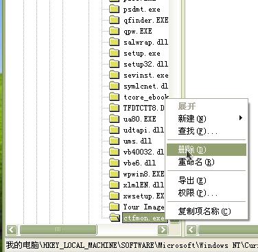 高级文字服务自动关闭:开始--运行--regedit 打开注册表,找到路径HKEY_LOCAL_MACHINE\SOFTWARE\Microsoft\Windows NT\CurrentVersion\Image File Execution Options 找到了这里,在下面再找到ctfmon.exe(项不是在右边的),把整个项删除。如图: