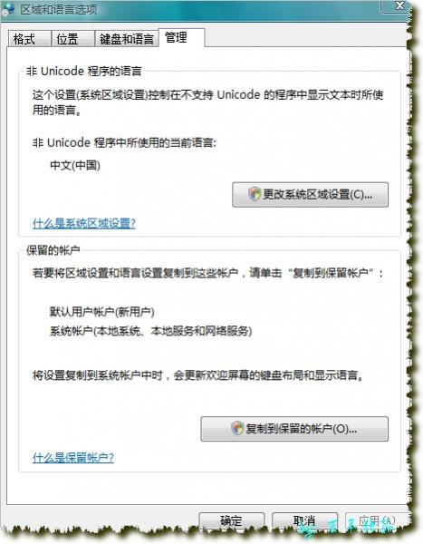 第三:如果还不行可以这样做,用administrator登录,给administrator用户设个密码,当然你也可以新建个管理员来设密码,然后用那个用户登录,到桌面--控制面板--时间,区域和语言--区域和语言选项--管理 那里,如图: