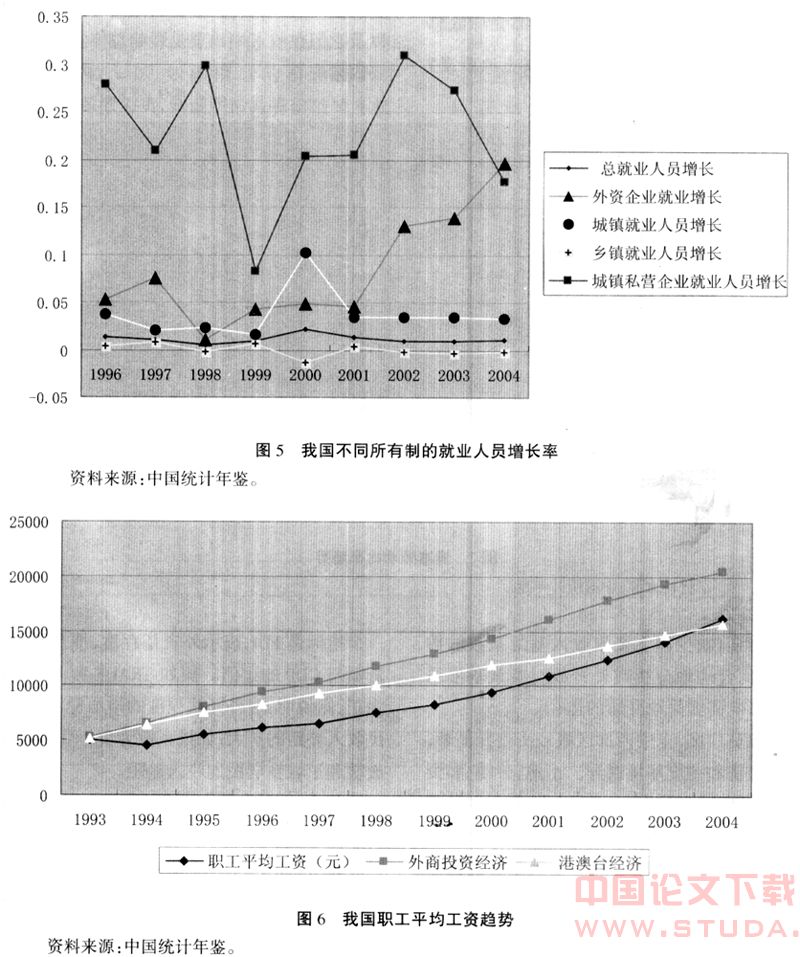(1)对劳动力的吸引。廉价的劳动是决定我国国际贸易模式和外资进入我国的重要因素之一。因此,我国扩大劳动密集型产品的出口和吸引大量外资提供的新的就业机会,总体上说是有利于劳动就业的增加,有利于农业劳动向非农业劳动的转移,从而有利于增加φ′W比重的。1996年以来,我国吸引劳动力就业增长率最快的是民营企业和外资企业,而且外资企业对劳动力的吸引持续上升(见图5)。所以,在加快我国农业劳动向非农劳动的转移过程中,国际贸易和引进外资发挥了重要的作用,有利于增加φ′W