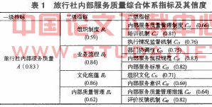 本研究的问卷设计突破传统的以服务质量感知为导向的分类,而主要以服务质量控制为主线,因此,侧重调查的是基于内部服务管理的旅行社内部服务的指标体系。开放式问卷获得内部服务质量评价指标共有48个,其中比较重要的指标有18个。为了客观获取对旅行社内部服务质量有重要影响的指标,本研究根据开放式问卷的结果,结合前人的研究结论拟定了《旅行社内部服务质量综合体系指标构建》的调查问卷,问卷设计的4个二级指标分别分布于组织制度、业务流程、文化底蕴和内部质量管理等方面,共设置了15个三级评价指标。此次问卷采用李克特的5点量表记录,调查共发放问卷237份,收回222份,有效问卷213份,有效率达89.87%。问卷调查所列出的15个三级评价指标,经过SPSS13.0软件包分析,按照均值、方差和变异系数比较来确定,最后对回收问卷的统计分析保留下来的有10个三级指标,其中,隶属于组织制度的有3个,隶属于业务流程的有3个,隶属于文化底蕴的有2个,隶属于内部质量管理的有2个,问卷所有内容的信度检验结果,其Cron—bach系数都在0.5以上,表明本研究的问卷设计在内容一致上的可信度良好,各指标、指标间层次关系和可信度如表1所示,由此可知本文所依赖的数据具有较高的可靠性。