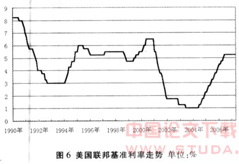 持续的利率下降更支持2000年以来的房地产持续繁荣。从2000年下半年开始,美联储的货币政策开始从加息周期进入减息周期。2001年1月,联邦基金利率下调50个基点后,到2003年6月,联邦基金利率降低到1%,联邦基金利率达到46年以来的最低水平。