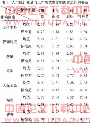 2.不同职级的管理人员和各工作满意度影响因素之间关系的探索性统计分析结果如表2所示。