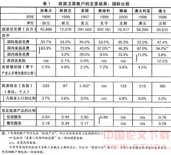 正因为旅游卫星账户使各国的旅游统计体系遵从了一致的标准,因此旅游卫星账户就成为了进行国际间对比旅游业经济贡献的一种工具。因为各国旅游卫星账户的表格填制遵从的是旅游业特征产品和旅游业特征活动清单的有关规定,所以它可以提供有关旅游的国际间可比的宏观经济总量,从而在揭示各国旅游业的规模及其经济重要性的基础上,很容易进行相互对比。目前,国际间旅游对经济影响的对比,已在实施旅游卫星账户的国家间进行。表1所列为一些国家旅游卫星账户的主要结果。
