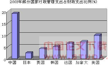 从上表中我们可以看出, 从改革开放初期的1978年至2004年的26年间,行政管理支出占财政总支出的比重,从1978 年的4.71 %增长到2004 年的19.38 % ,实际支出数额增加了103倍。从1989年到2004年,行政管理支出平均每年增长高达19.83 %。从全世界范围来看,以2003 年为例,我国的行政管理支出占财政总支出的比重为19.03 % ,这个比重,比日本的2.38 %、英国的4.19 %、韩国的5.06 %、法国的6.5 %、加拿大的7.1 %、美国的9.9 %分别高出16.65、14.84、13.97、12.53、11.93 和9.13个百分点。