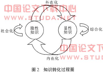 (3)显性知识向显性知识转化过程:组织将一些分散的显性知识整合成新的更复杂或系统化的显性知识,以便在组织范围内使新知识得以共享,这是知识的综合化过程;