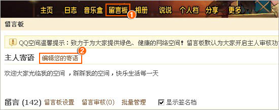 第一步:登录您QQ空间,进入“留言板”的右端点击“编辑您的寄语”;